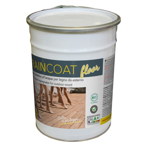 Impregnaciono ulje za drvo na bazi vode. Posebno pogodno za tretman spoljašnjih drvenih podova (deking pored bazena, terase, staze za hodanje), okvira prozora, paviljona, ograda i drvenih nadstrešnica. RAINCOAT FLOOR LIGHT se sastoji od emulgiranih ulja i smola na bazi vode, čije se reaktivne grupe vezuju za lignin drveta, ojačavajući ga i značajno odlažući njegovu degradaciju. Održava prirodni izgled drveta.